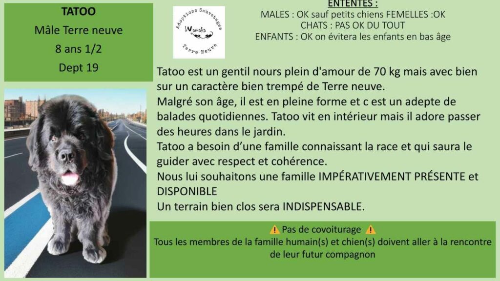 Tatoo est un gentil nours plein d amour de 70kg avec le caractère bien trempé du Terre-Neuve.